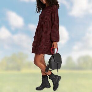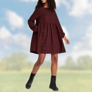 NWT Burgundy & Black Plaid Flannel Baby Doll Dress - Womens Juniors Size XS