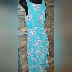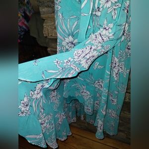 Sandra Darren turquoise dress ruffled faux wrap, floral, belted, size 10