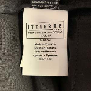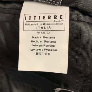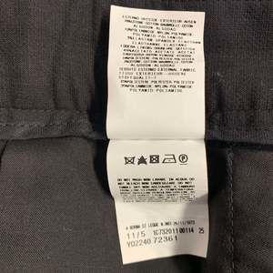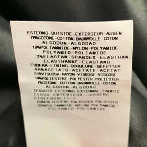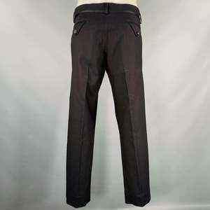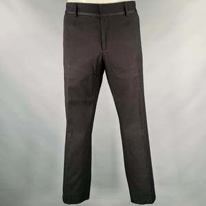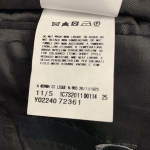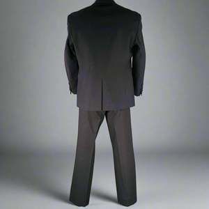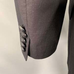 in a black cotton blend with a full liner and includes a single breasted, single button sport coat with a peak lapel and matching flat front trousers.Very Good Pre-Owned Condition. Moderate signs of wear, as is.