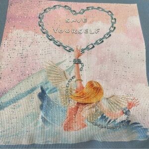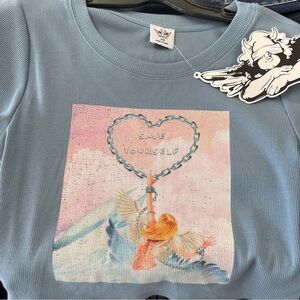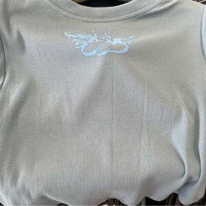 Pair this crop top with your favorite high-waisted jeans or maxi skirt.Blue ribbed crop tee with rounded neckline and cap sleeves. Features distressed graphic, puff print logo, and contrast stitching. Model is 5'9 and wearing size Small. Hand wash in cold. 58% Cotton, 35% Modal, 7% Spandex.