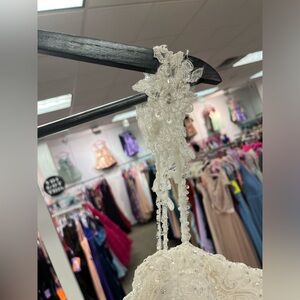 This beautiful Mori Lee mermaid design features a sheer bodice, lace detailing throughout the bodice and hips, a full ruffled tulle bottom, gorgeous floral lace and bead straps, and a chapel length train. With just the right amount of sparkle, this dress is perfect for a bride wanting to show off all her curves in all the right places!
