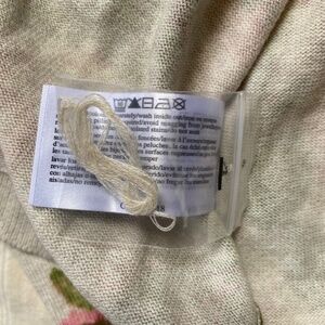 This beautiful Laura Ashley cardigan sweater is perfect for any occasion, whether you're traveling, going to work, or just relaxing at home. The tight-knit cotton fabric features a gorgeous beige, pink, and green floral pattern, with mother of pearl buttons. The sweater has a crew neckline, long sleeves, and a roomy fit, making it comfortable and stylish. The sweater is lightweight and suitable for all seasons, with a collarless design. It's a classic piece with a colorful and flower-themed design, perfect for those who love cottagecore.