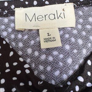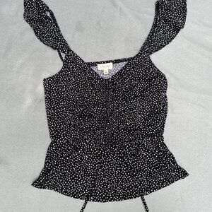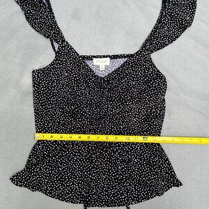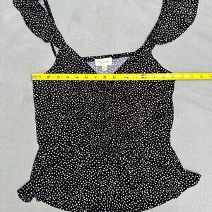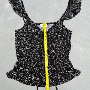 Black with white polka dots. Ruffle strapped tank with ruching and peplum waist. Very comfy and lightweight.
