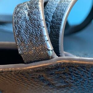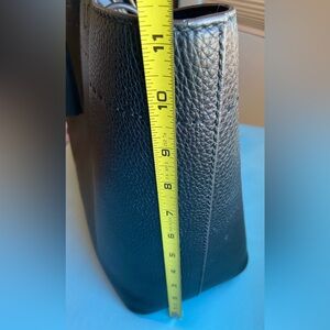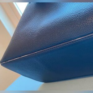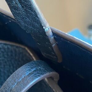 The leather is a firm pebbled black on the outside, and a deep smooth navy on the inside. It shows signs of wear along the bottom front edge where it appears as white-ish scuffs, and cracked edge on the strap where it meets the tote. There are book/ binder dents on the bottom inside, and the outside front and back have been shaped in their worn-in way from being used.