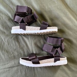 * Nylon upper, insole * Raffia heel * Rubber outsole * Fabric tab strap closure hook and loop with velcro * Imported