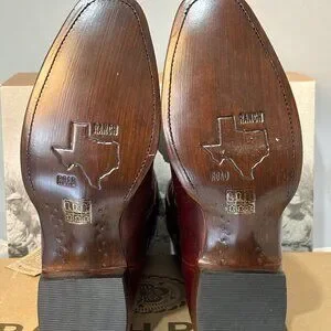 Round pull-up Spanish calf. Self colored collar and side piping. 3 row shaft stitch. Fully calf leather lined. Three quarter Goodyear welt. Fiddled shank with double row lemon pegs. Leather stacked heel and rubber toplift.