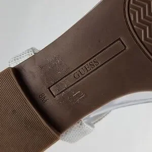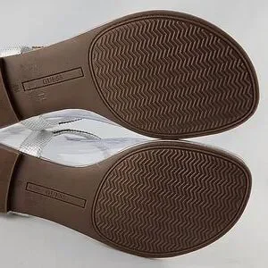 Good pre-owned condition, GUESS women's flat silver bejeweled rhinestones straps thong sandals, size 8M.