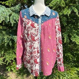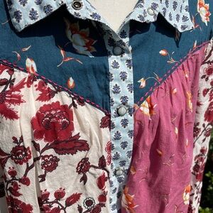 Soft lightweight 100% cotton with pearl and brass snaps. In great condition. 24” across chest, 26” length in front and 30” length in back.