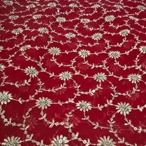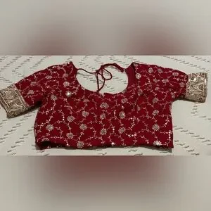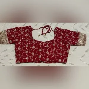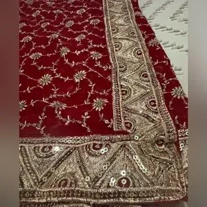 This is a very beautiful red saree/sari with gold design all over with gold border. The Blouse size is 36. Only worn once. This is a very elegant piece.
