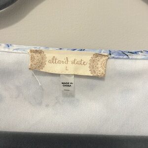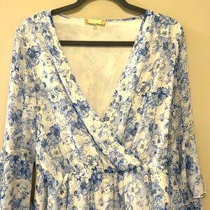 Altar’d State white & light blue floral design romper. Long bell sleeves. Deep neckline. White slip lining underneath.