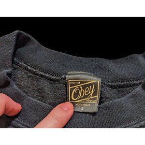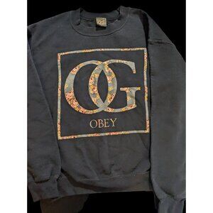It's made of a warm, black sweatshirt fabric. It has a classic crew neck, and long sleeves. The front says "OG Obey" in pink and grey floral print. There is also a large floral print open box around the design on the front.