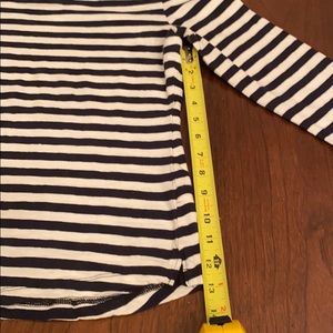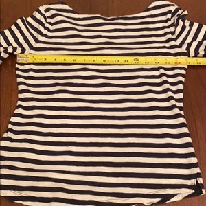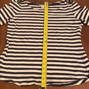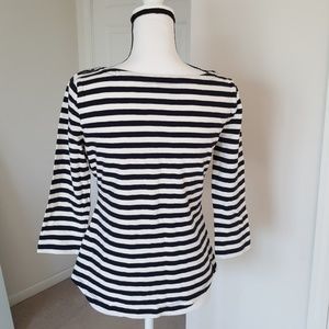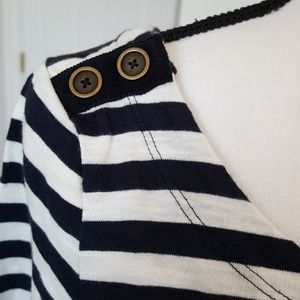 Navy and white striped 3/4 sleeve top with buttons(non-function) on the shoulders. Scoop crew neck