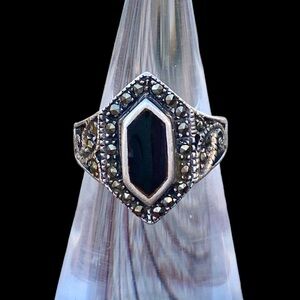 Vintage Art Deco Sterling Silver Black Onyx Marcasite Woman’s Ring Jewelry