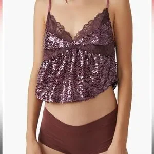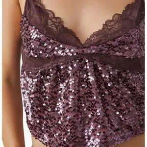 Light up the night in this slinky cropped cami covered in glittery sequins and trimmed with lovely lace.