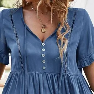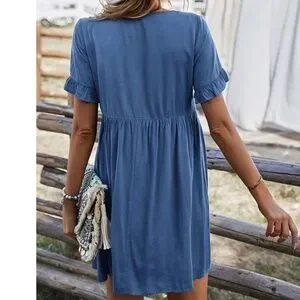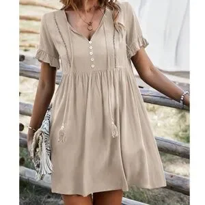 Boho Khaki Button Detail Ruffle Short Sleeve Mini Dress