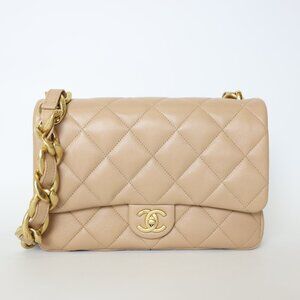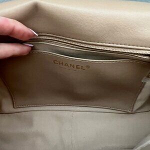 Chanel Funky Town Flap in the large size. This bag comes in beige lambskin leather with brushed gold hardware. It measures approx. 10.5 x 6.75 x 2.5 in. with a 12 in. strap drop.