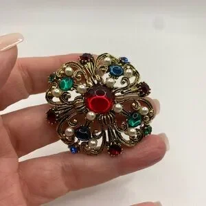 Gripoix Mogul Jewel Tone Style Gold Tone Faux Pearl Glass Rhinestone Pin Brooch Vintage