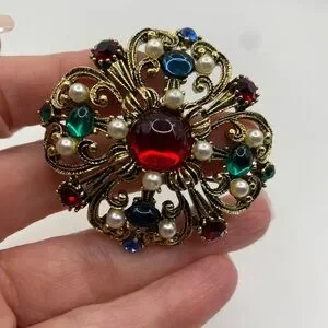 Gold Tone Scrolled Brooch featuring red prong set rhinestones off set by pearls and red, green, and blue cabochans