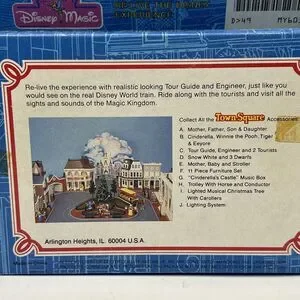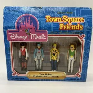 This rare Disney Magic Town Square Friends Tour Guide & Engineer & 2 Tourists from 1988 is a must-have for any Disneyana collector. The set includes a tour guide and engineer who are both dressed in their signature outfits, along with two tourists who are also in their original attire. The guide and engineer are holding their hands in a pose, as if they are giving a tour of the town square.