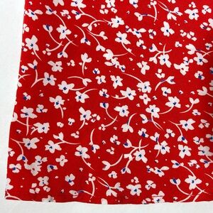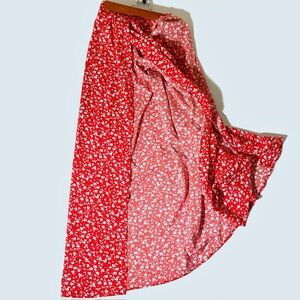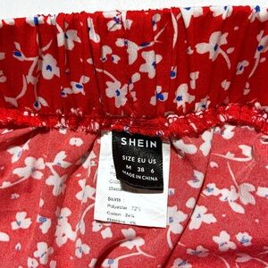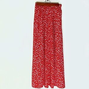 red with white and blue floral pattern, size M, 2 front slits that go up to the waistband but the fabric panels cover over the slits, elastic waistband, no inner lining, no zippers or pockets.