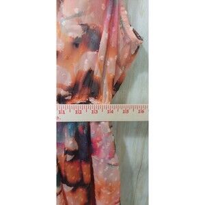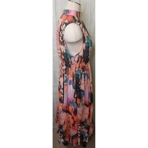 This beautiful Torrid midi dress is sure to turn heads with its stunning geometric pattern and multicolor floral design. The dress features a high neckline with a button closure and sleeveless blousons for a comfortable and stylish fit. Its lined and sheer chiffon fabric is perfect for any occasion, whether it be a wedding, party, or casual outing.