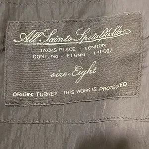All Saints Spitalfields jacket. Two side pockets, double breasted, tie sash.