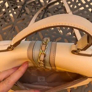 Colors of light blue and beige as seen in the first picture. This is a nice mini purse that is stylish with cute silver chain detailing. Very good used condition.