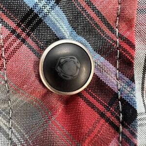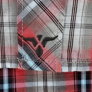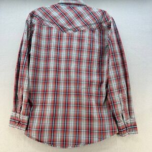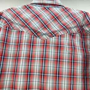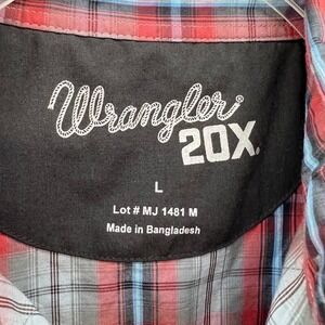 Wrangler 20X Long Sleeve Button Up Western Shirt. Black, red, and gray plaid print. Black pearl like buttons. Collared shirt. In good preowned condition with minimal signs of wear. Tagged men's size Large.