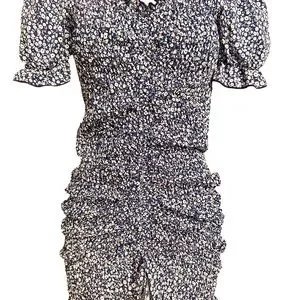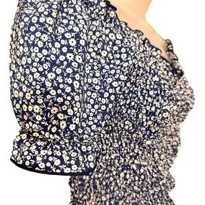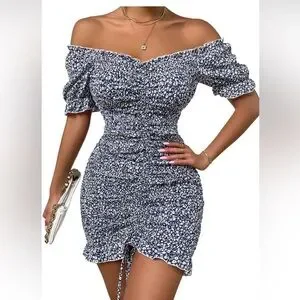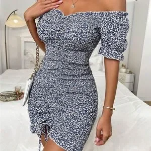 Sexy Spring/Summer smocked dress. Floral print. Drawstrings. Off shoulders. Blue.