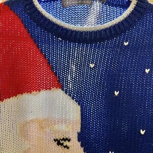Ugly Christmas Sweater Santa Claus VTG Pinwheels Loose Knit Acrylic Korea Sz S. Amazing design on the front, open kind of tight but still loose knit with some stretch available. Light shines through it.