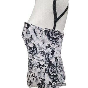 Elevate your wardrobe with this stunning strapless floral top by White House Black Market. The black and white color scheme is classic and versatile, making this blouse perfect for any occasion, from casual outings to travel adventures. The full zip closure and woven fabric type add a touch of sophistication to the top, while the slimming and lined features ensure a flattering fit. Made of Spandex and Cotton, this regular fit blouse has a sleeveless design and a strapless neckline that exude elegance and femininity. The top is easy to care for, requiring dry cleaning only, and is suitable for all seasons, from summer to fall to spring. This designer piece is a must-have addition to any fashion-forward woman's collection. CLOTHING AND FABRIC ITEMS: All clothing and fabric items have been steam cleaned and/or washed.