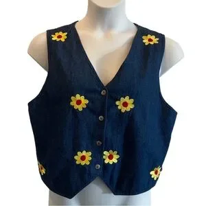 Vintage pre-owned adorable denim vest with flowers Embroidered on it. Good condition with no holes or stains. Size measurements are shown in the pictures. Size XL