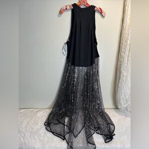 Features: Soft fabrication at the body, crew neckline with ribbed trim, sleeveless silhouette with low-cut armholes, dropped waist detail, sheer sequin piecing, flowy asymmetric hemline