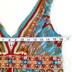 Nicole Miller 100% Silk V-neck with embroidered beaded band. Zips on side