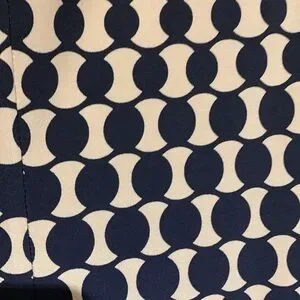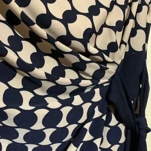 Material: see picture- stretchy, pull over, round neck, ruched to the left at the waist with tie, lined from waist up only, large circles/polka dots, tan/black but when I took picture inside out -see picture before last -looks like very very dark navy blue, polyester/spandex blend, machine wash