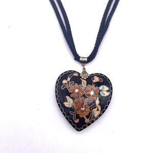 Vintage Enamel Heart Flowers Scalloped Pendant Black Braided Cord Necklace