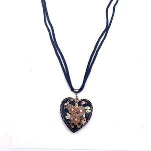 Vintage Enamel Heart Flower Scalloped Pendant Black Braided Cord Necklace 27"
