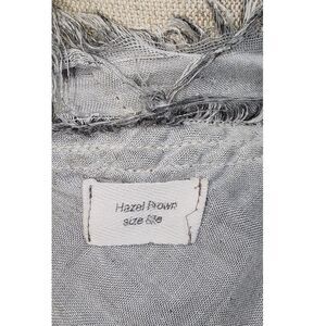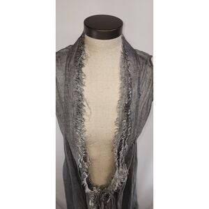 Hazel Brown Sleeveless Fringed Grey Cardigan Size Small. This super cute tunic style cardigan features a fringed raw edge, tie around waist and is super lightweight and somewhat sheer. Very stylish!