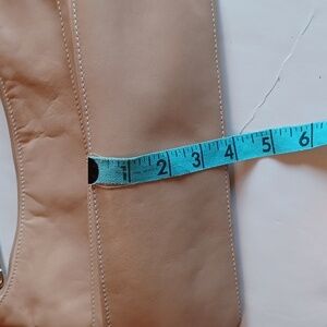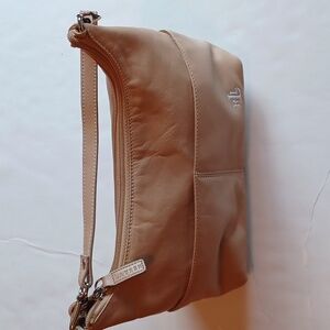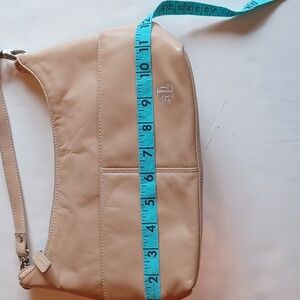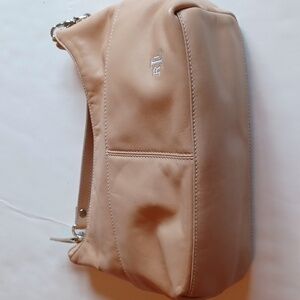 This is so cute and barely worn. Please see photos for size and condition. Has two outside pockets and one zippered one inside. Very clean inside and out. One tiny, barely noticeable mark on the front. (last photo). No shoulder strap; it didn't come with one.