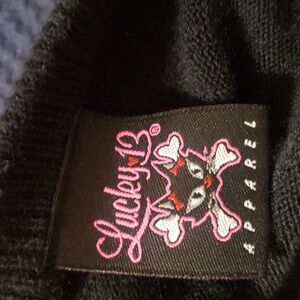 FUN JUNIORS/WOMANS PREOWNED LUCKY 13 APPAREL BLACK BUTTON SWEATER WITH SPIDER CHARACTER SIZE MEDIUM. BUTTON FRONT. 100 ACRYLIC. THERE IS A SMALL RUN/ SCUFF ON FRONT..NOT A HOLE.. I ATTEMPTED TO TAKE PHOTOS WITH A BRIGHTER FILTER TO PROVIDE A LOOK AT IT. ITS NOT NOTICEABLE UNLESS LOOKING FOR IT.