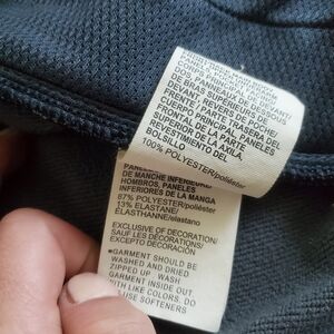 Sleeves are 100% polyester, shell/interior is 87% polyester and 13% elastane. The zipper pull is scratched and the jacket has been mended underneath the embroidery patch, but it's in great used condition with lots of life left!