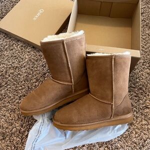 Only worn couple times during last winter, it’s very cozy and warm indeed. The color is more like pecan color. It’s seem like run a little small; if you are size 7.5W or has narrow feet of size 8W, then this boots is definitely for you.