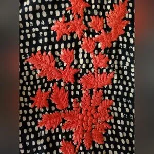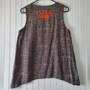 This THML sleeveless blouse, tank top style shirt is black with tan/beige/taupe dots, & orange floral embroidery. It has an asymmetrical hem. Very pretty!