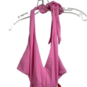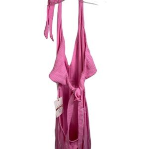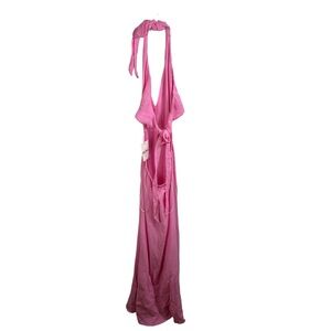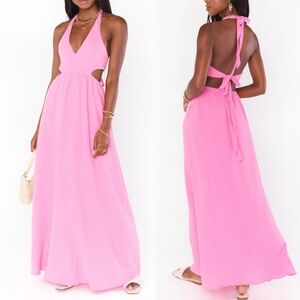 Take in the views and enjoy the scenery in style wearing the Marisol Maxi Dress! Lightweight bubblegum gauze fabric shapes a v-neck bodice with flirty side cutouts, held up by a halter neck and open tie back. We love her dressed up with platforms and layered gold accessories, or paired with sandals and rattan hat for a laid back vibe.