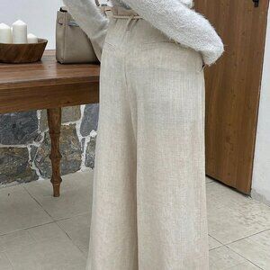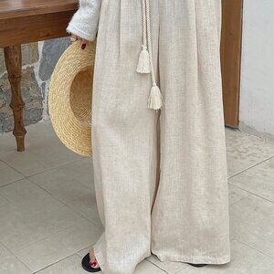 Beige Casual Women's Loose Fit Folded Pleat Wide Leg Pants