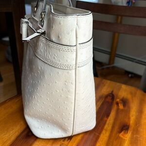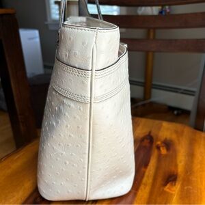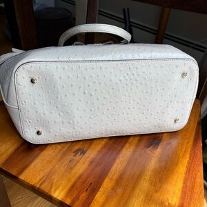 Pebbled ostrich leather with cute bow embellishment on the front and very roomy with large, zip external pocket.