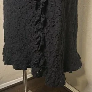 Lined with full black lace detail, small ruffle around neck and bow accent in front. Ruffle at bottom with side zip up. Size M.