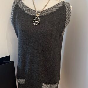 CHANEL DRESS Cashmere Short Sleeves GRAY CC twist hardware on pockets Size 44