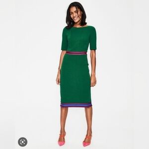 This is a gorgeous Kaia Ottoman sheath dress by Boden. It is a rich green color with pink and purple bands at the waist and hem. The Ottoman is an all-forgiving medium weight textured stretch jersey fabric. Size 6P; Shell: 57% Cotton, 42% Polyester, 1% Elastane; Lining: 100% Polyester. The dress has a rear kick slit and a rear zipper, with ribbon pull closure. There is a small discoloration on the left sleeve (see pic) that will likely come out in wash. NWT; Excellent condition.