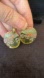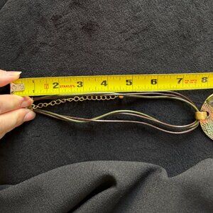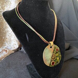 The pendant and matching earring rounds are divided into 2 diagonal halves. One half is a pebbly texture in a mix of the moss and dark red colors. The other is a deep glossy enamel in the green hue, with spots and swirls of red and gold. The cords measure 16 inches. The pendant is a generous 2.25 inches. It's large bale makes changing necklaces a snap.